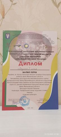 14 жовтня 2025 року в Університеті короля Данила (м. Івано-Франківськ) відбувся гала-концерт і нагородження учасників і переможців ІІ Міжнародного фестивалю-конкурсу «Мистецькі промені України» – мистецька подія, що об’єднала учасників з різних куточків світу. Шестикласник Калуського наукового ліцею імені Дмитра Бахматюка, слухач дослідно-експериментального гуртка фольклористики Івано-Франківського обласного відділення МАН України, який працює на базі цього закладу, Матвій Петрів під орудою учителя української мови і літератури, керівника гуртка Півторака Віталія Романовича став лауреатом (І місце) в номінації "Театральний жанр (художнє слово)", аматор ІІІ вікової категорії. Вони отримали диплом і подяку за підписом першого заступника директора Департаменту культури Київської міської адміністрації Миколи Шуляка з рук ідейної натхненниці й голови журі конкурсу Лесі Королик-Бойко.